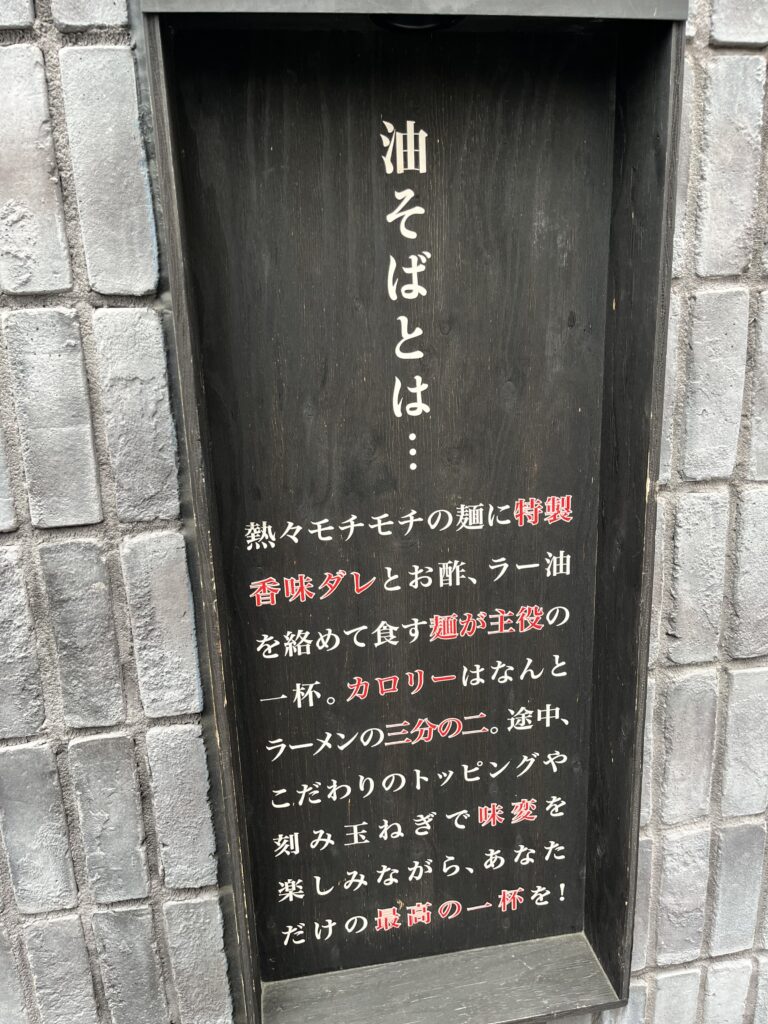 東京を中心に店舗展開している人気油そば専門店で、街中で赤い看板を見かけたことがある方も多いのではないでしょうか。