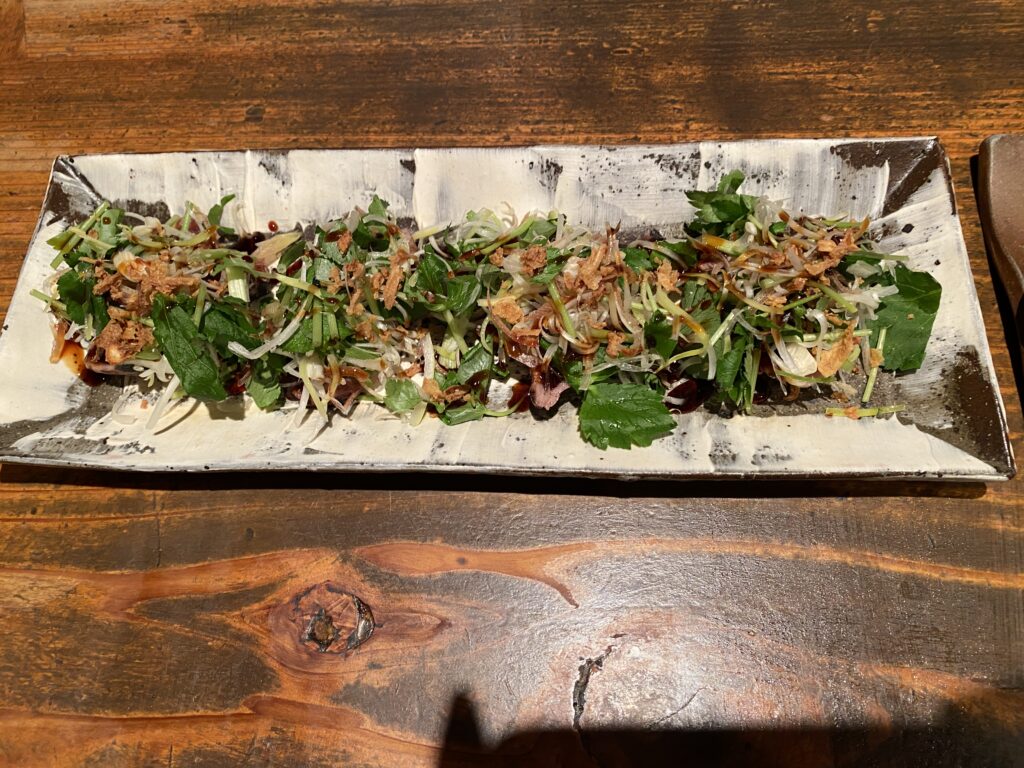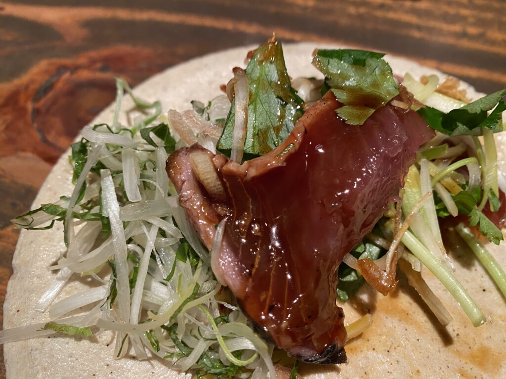 鰹は厚切りでモチっとした食感で新鮮。薬味との相性抜群で、蕎麦前に最適。
