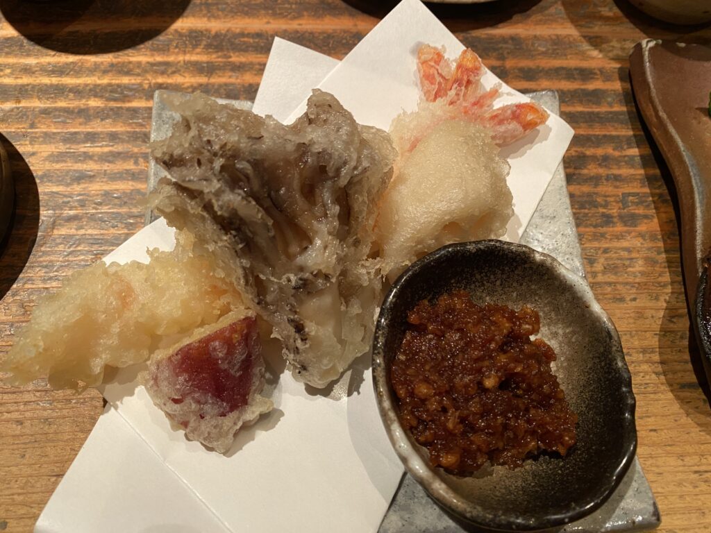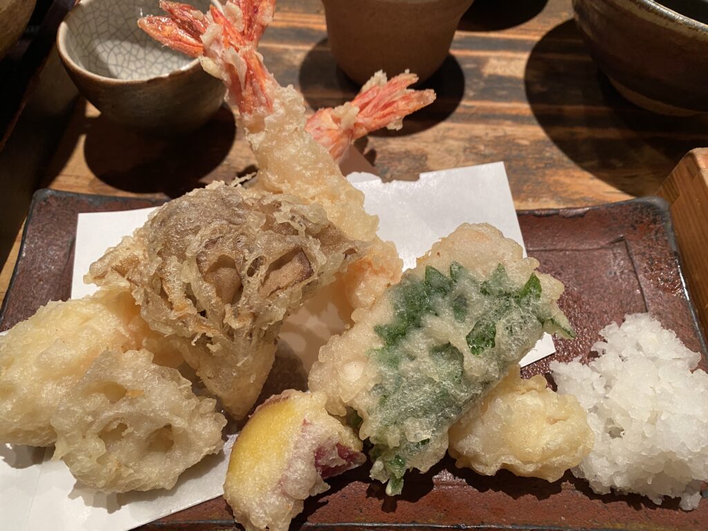 大えび2本、鶏しそ巻き、蓮根、舞茸、さつま芋など豪華な盛り合わせ。