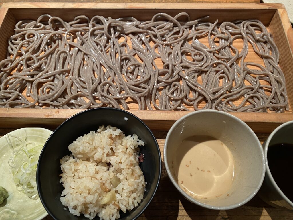 蕎麦は細打ちを選択。通常つゆは鰹だれだけですが、胡麻だれもオーダーして2種で味変も楽しみました。