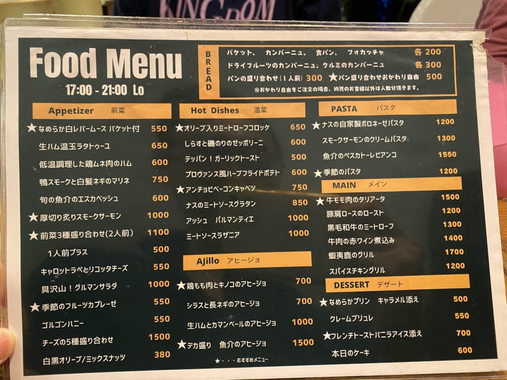 前菜・温菜・アヒージョ・パスタ・メイン・デザートと、本格的なビストロメニューが並びます。
