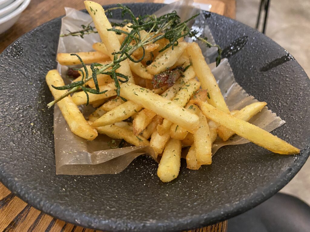 ローズマリーの香りが食欲をそそります。カリッと揚がったポテトがワインにもぴったり。