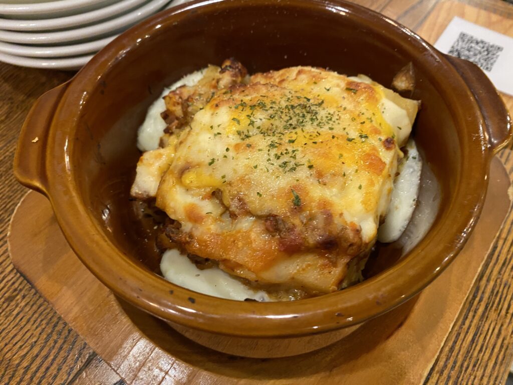 ミートソース好きには、たまらない逸品。焼き加減がちょうどよく、何層にもなったミートソース、生地、チーズでコク深く食べ応えがあります。