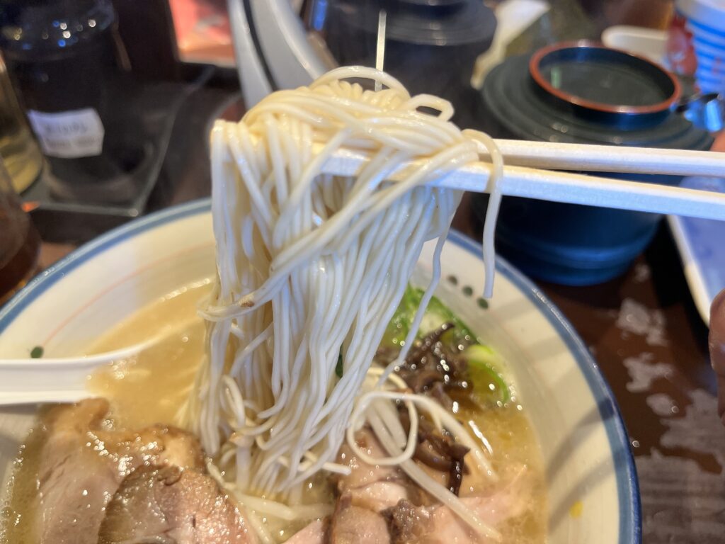 バリっとかたい麺。麺がスープを吸わないので替玉をたくさん食べたい方はぜひ。
