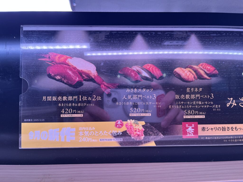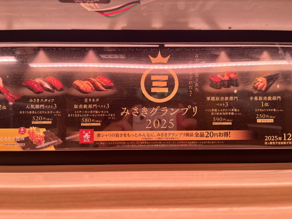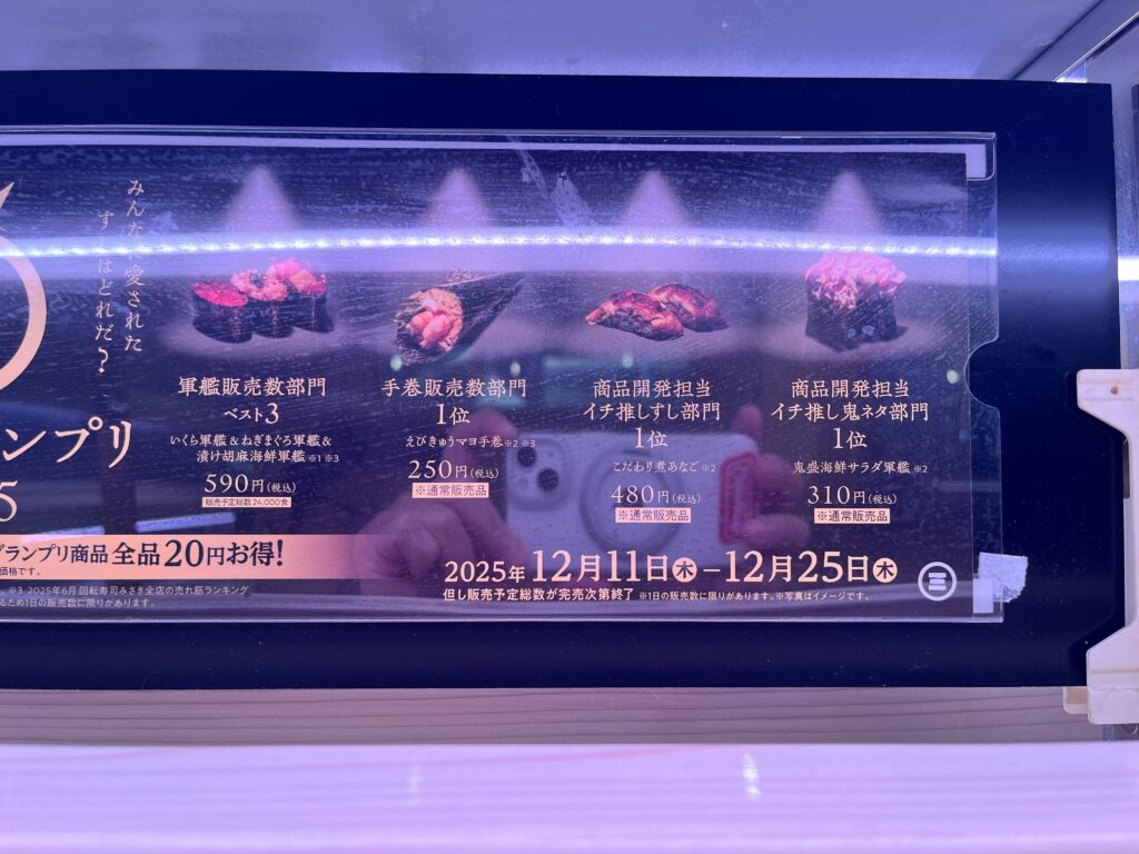 スタッフ人気部門おすし、月間販売数上位のおすし、商品開発担当イチ推しなど・・・色々な部門グランプリが掲示されています。グランプリ商品は、2025年12月11日木から2025年12月25日木の期間で20円引きでお得です。