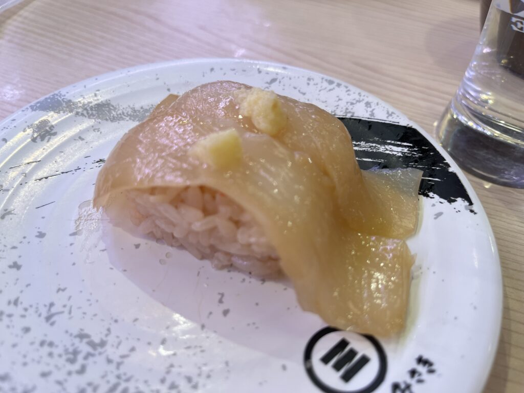 一つ食べてしまいました。シャリの上には大葉がのせてあります。えんがわの「コリコリとした独特の食感」と「脂の甘み」を楽しみます。