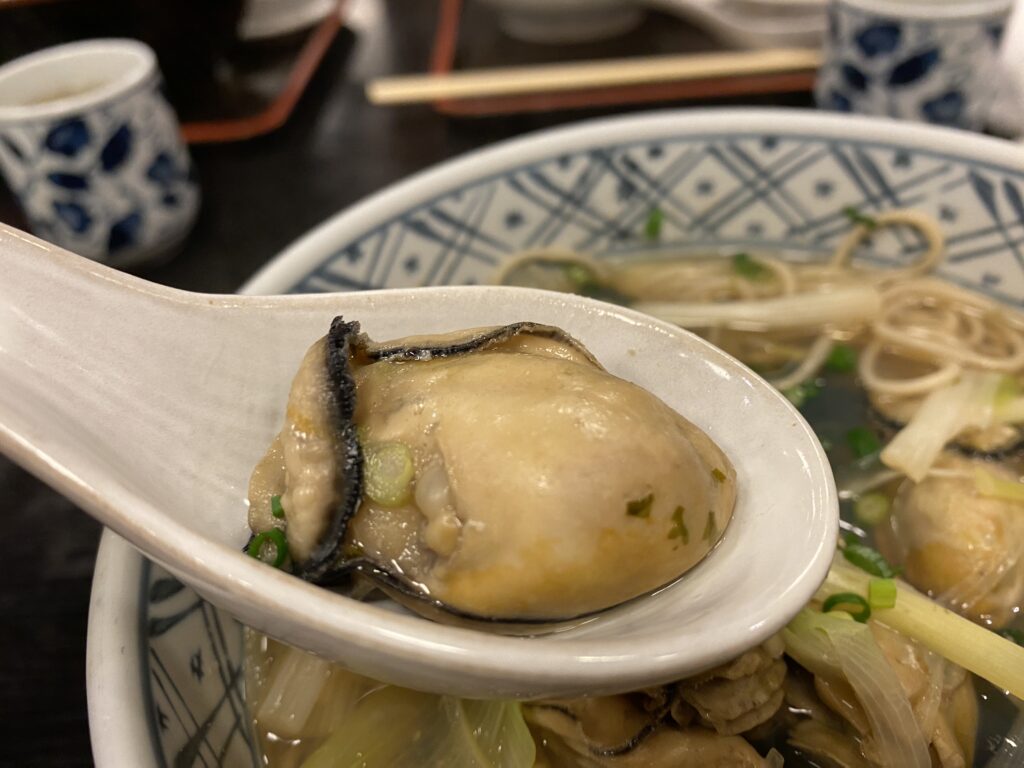 牡蠣は、プリッとしています。かきそばは、牡蠣好きにはたまらない一品です。