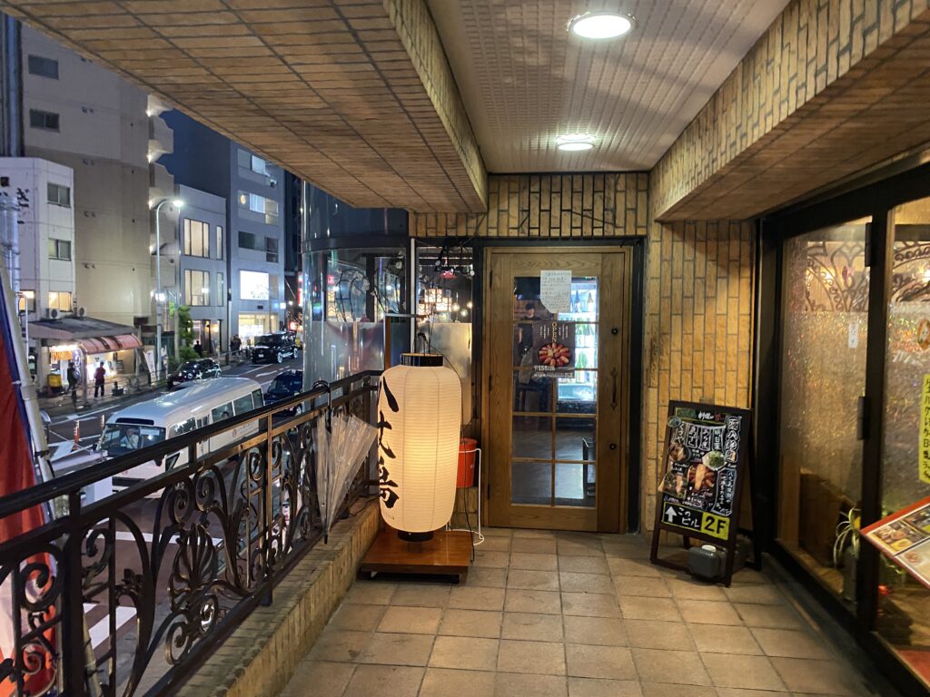 2階の入口、左側が権之助坂です。源八船頭 目黒店は、東京都目黒区下目黒1-3-28 サンウッド目黒2Fにあります。