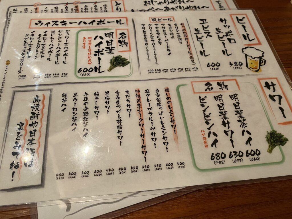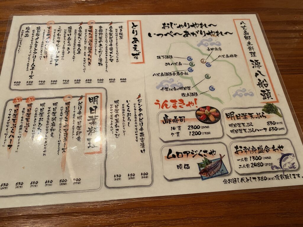 八丈島では「おじゃりやれ」は「いらっしゃい」の意味。店内のメニュー表には料理だけでなく、島の焼酎や酒造店の紹介も掲載されており、食事を通じて八丈島の文化を感じられます。