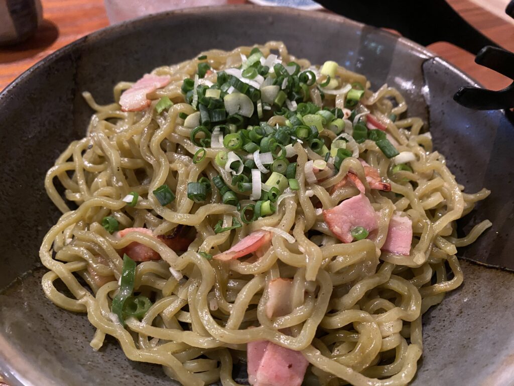 明日葉を練り込んだ自家製麺をペペロンチーノ風に仕上げた一品。思ったより辛めなので、お子様連れは注意が必要です。