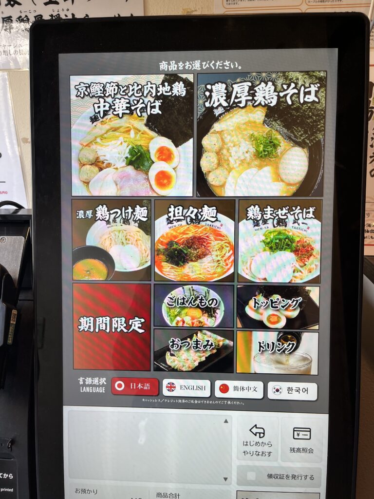 店頭のタッチパネル式食券機で注文&決済。