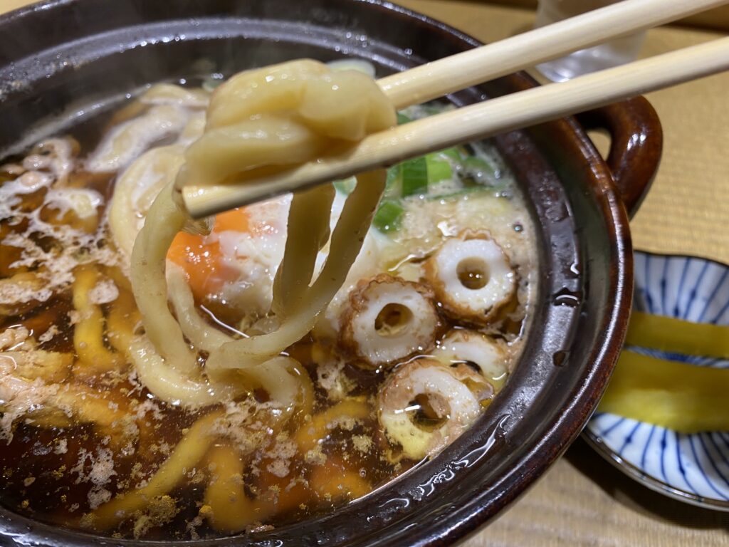 - 手打ちの極太麺がクセになる食感