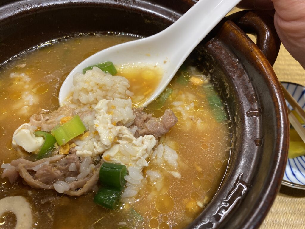 麺を食べ終わった時点でも満足感がありますが、ライスを投入して親鶏雑炊にします。濃厚な鶏出汁の醤油スープを余すことなく食べ、食べ終わる頃にはハンカチを片手に、額から汗をかくほど、体も心も温まります。