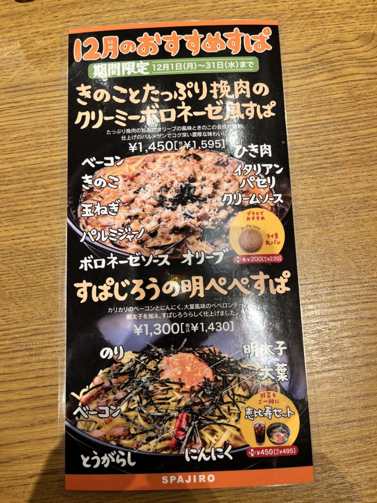 12月は、きのことたっぷり挽肉のクリーミーボロネーゼ風すぱと、すぱじろうの明ぺぺすぱです。