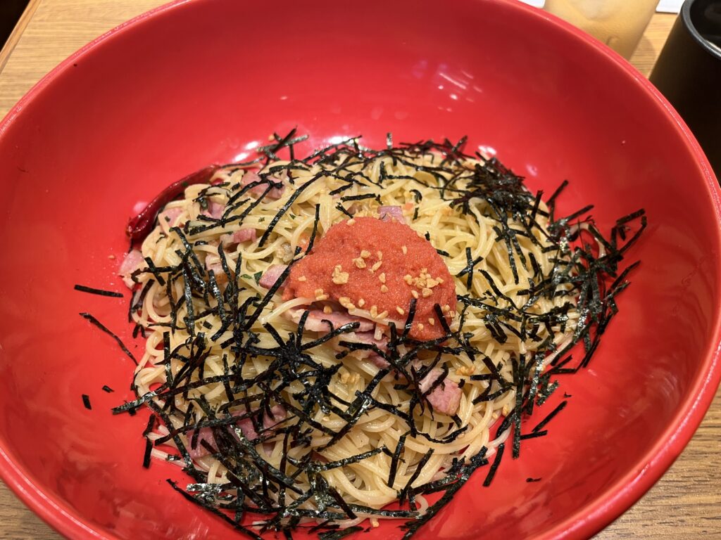 のり、ベーコン、明太子、大葉、ニンニク、とうがらしが入っています。カリカリのベーコンがあったり、のりやニンニクの風味が良く、すぱじろうらしく仕上がっています。