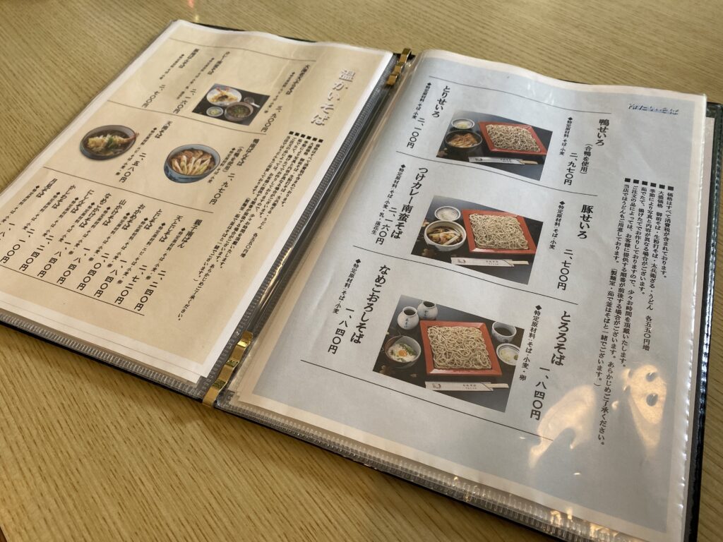 どれも美味しそうな鴨せいろ・とりせいろ・豚せいろ、つけカレー南蛮そば、とろろそばなど。