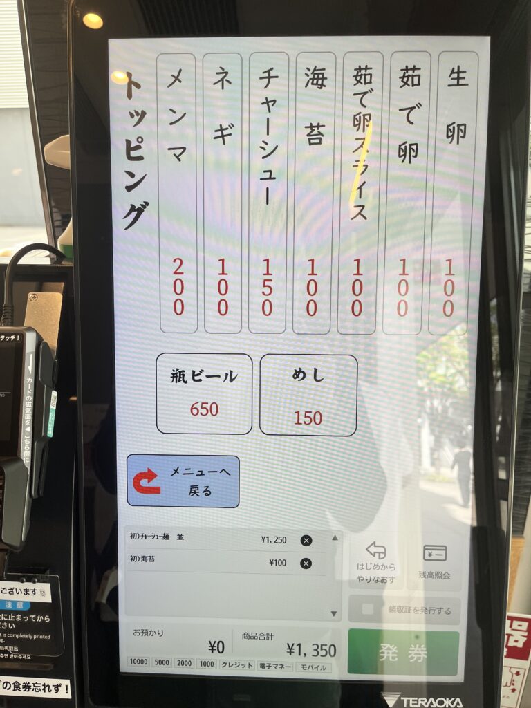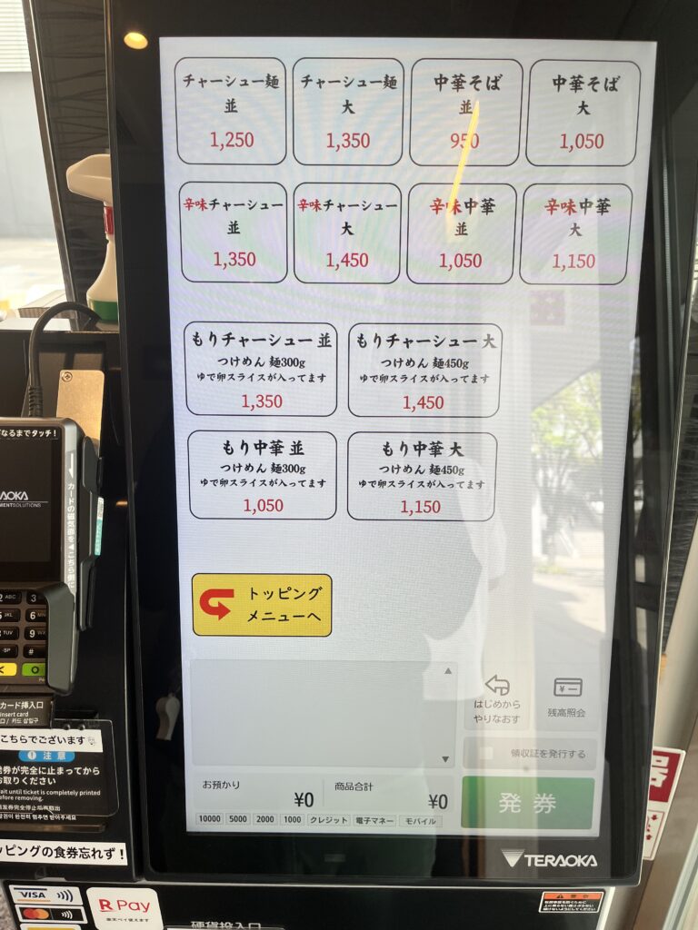 支払い:タッチパネル式券売機(クレジットカード・電子マネー対応)