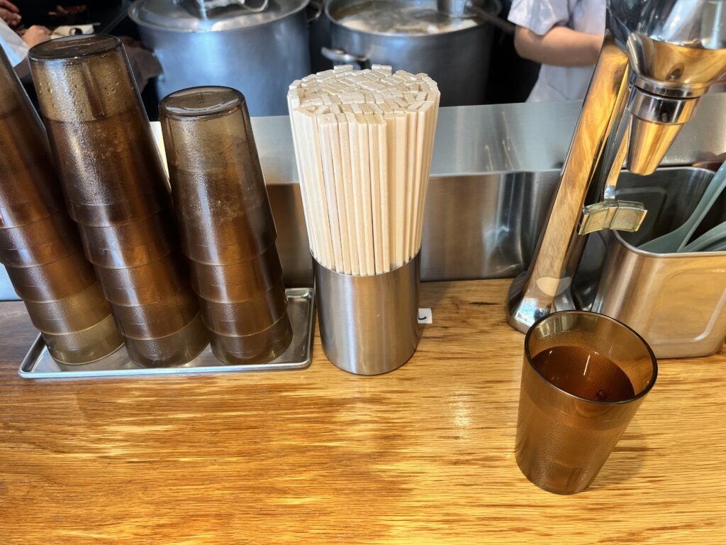 カウンターには、割り箸、レンゲ、コップ、卓上調味料などが置いてあります。