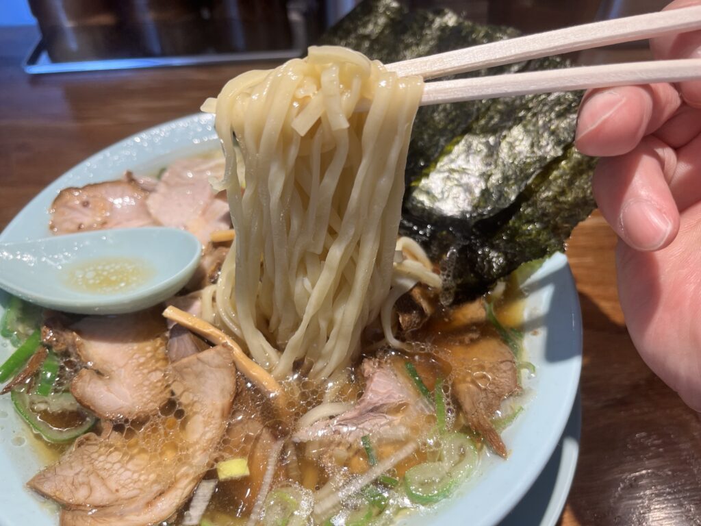 平たい形状の面が、スープとの絡みもよく、スルスルと食べ進められるタイプです。