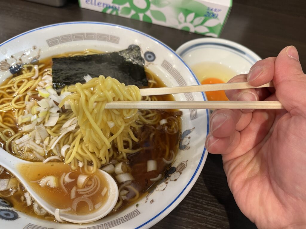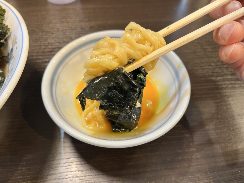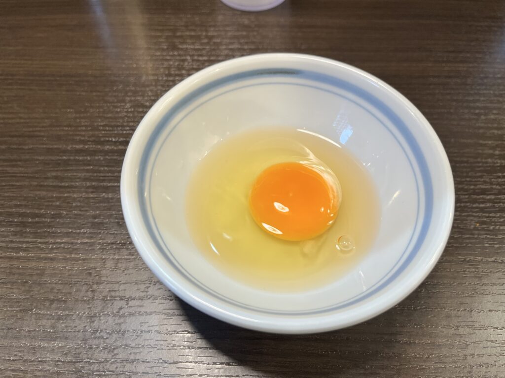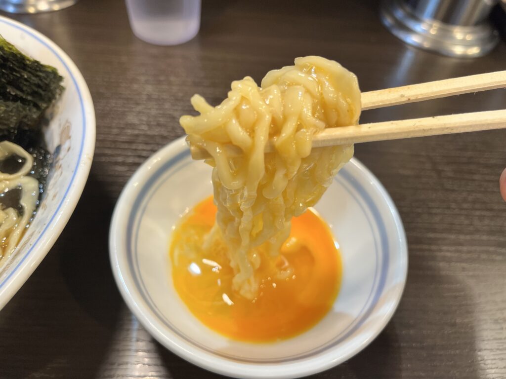 半分ぐらいを食べたところで、生玉子に麺を潜らせていただきました。