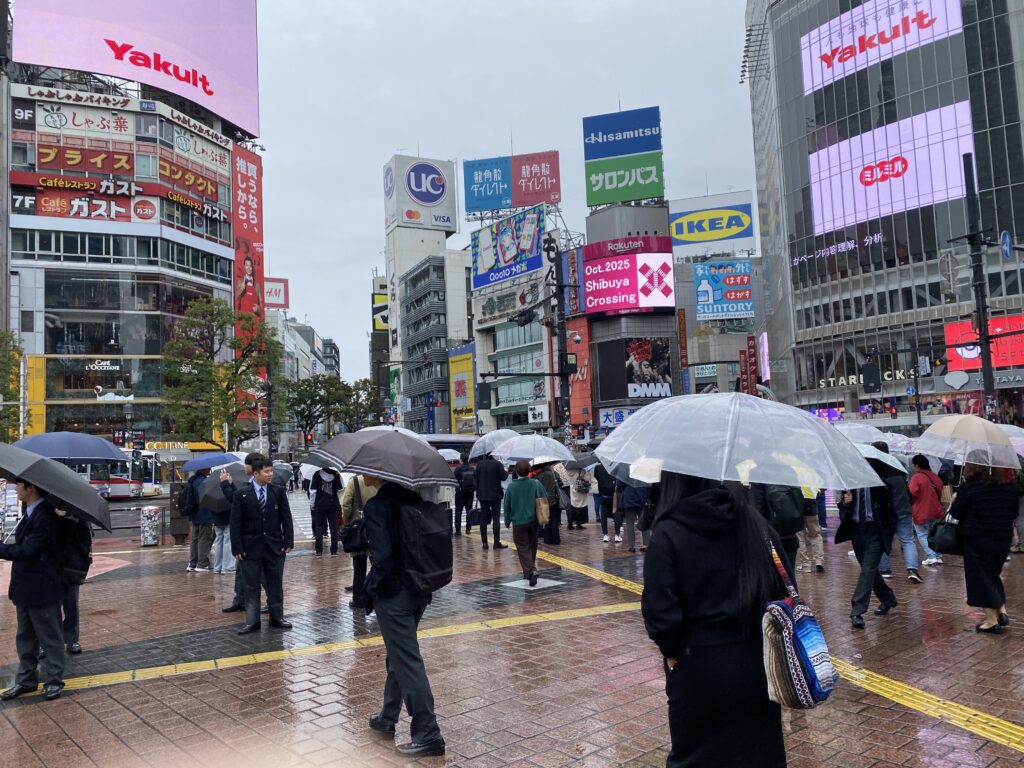 ハチ公口を出ると、あいにくの雨です。渋谷スクランブル交差点は傘で先が見えないです。