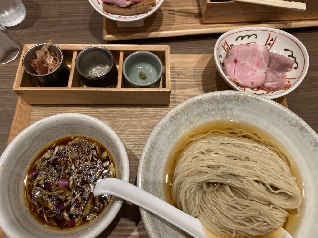 つけ汁は鶏の旨味と醤油のキレがバランス良く、すっきりした口当たり。チャーシューは低温調理で柔らかく、チャーシューに隠れているトロトロ食感のメンマも印象的でした。つけ汁は昆布水で味を調整しながら食べるとマイルドになっていきます。
