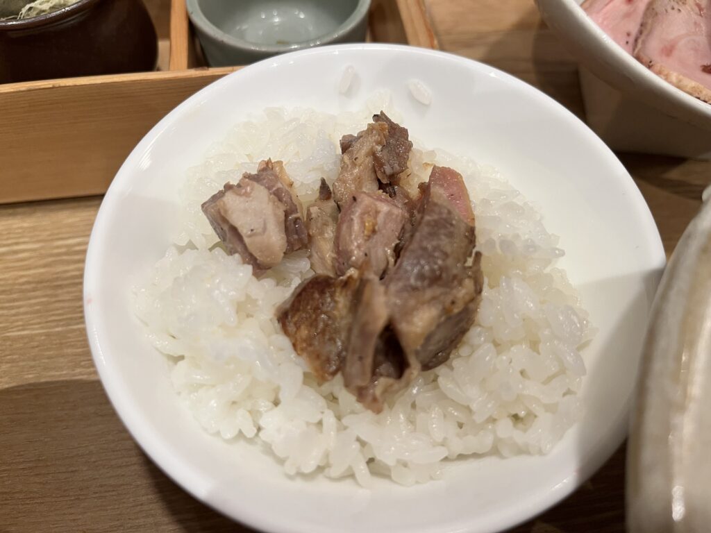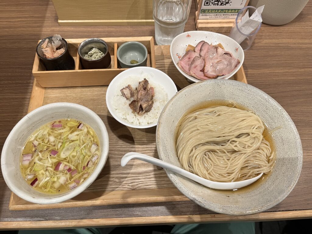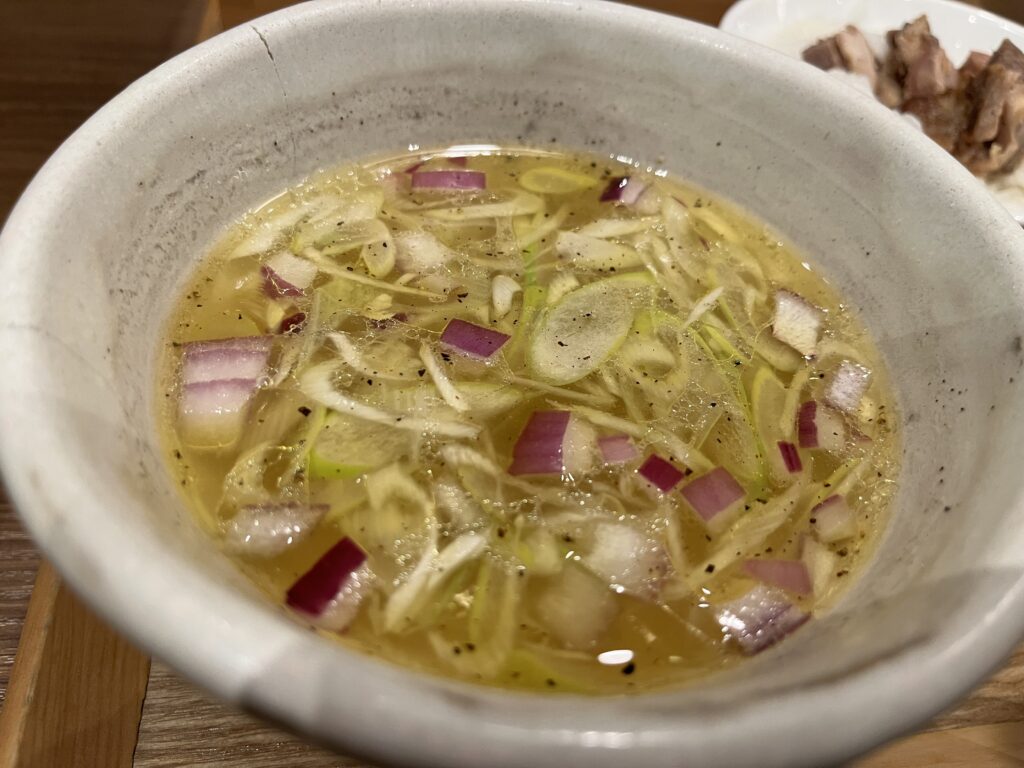 つけ汁は鶏の旨味と醤油のキレがバランス良く、すっきりした口当たり。チャーシューは低温調理で柔らかく、チャーシューに隠れているトロトロ食感のメンマも印象的でした。つけ汁は昆布水で味を調整しながら食べるとマイルドになっていきます。