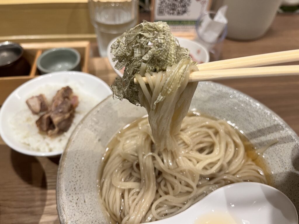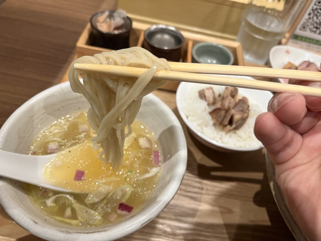 美しいビジュアルから丁寧さが伝わる一杯。雑味のない地鶏スープに、繊細な塩味がマッチ。シンプルながら深い味わいを楽しめます。