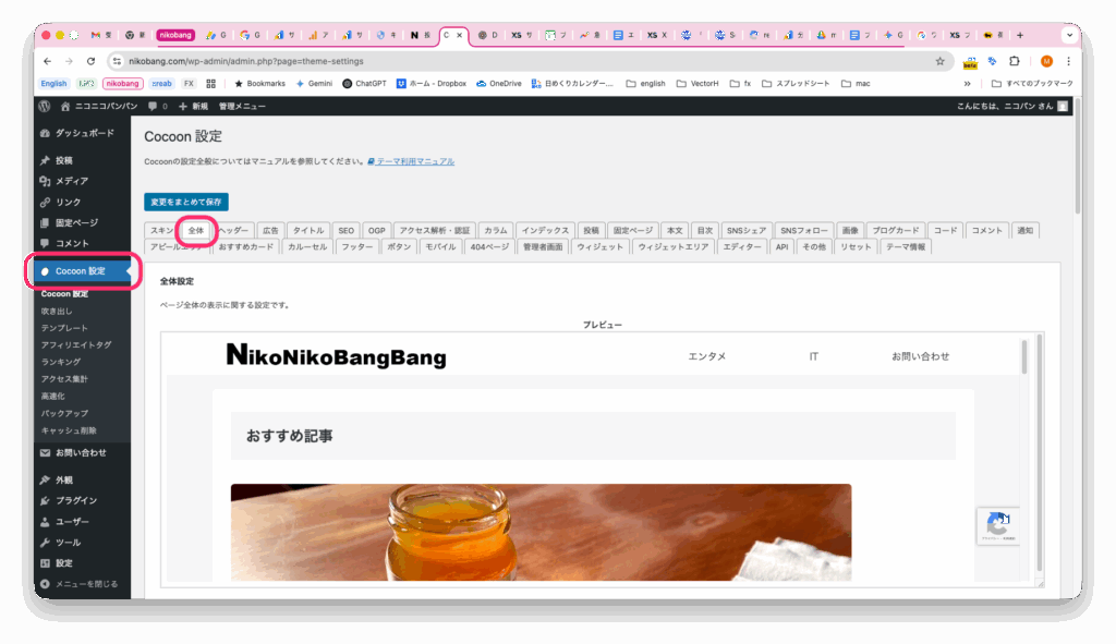 Cocoon設定→全体タブ