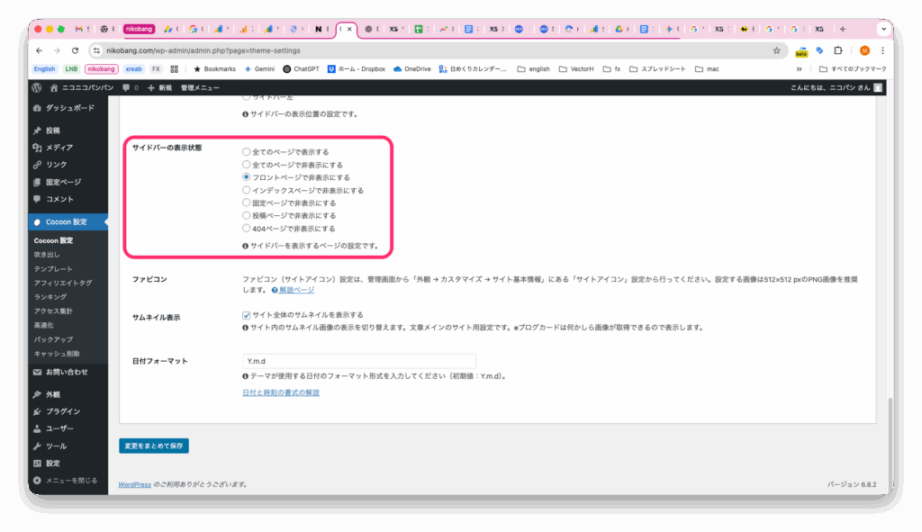フロントページからサイドメニュー非表示(Cocoon設定→全体タブ)
