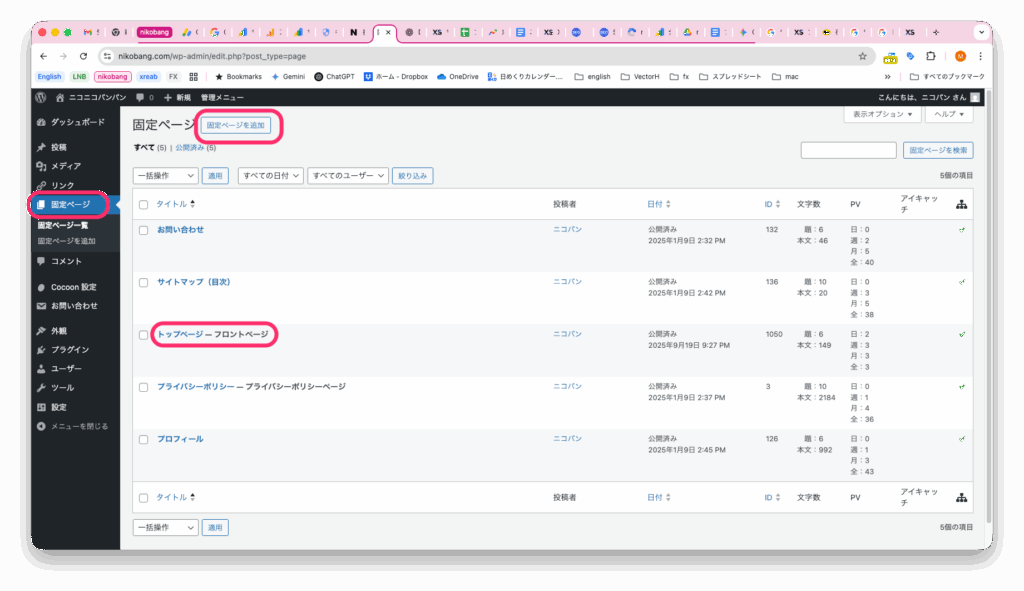 固定ページで「固定ページ追加」を押下します。