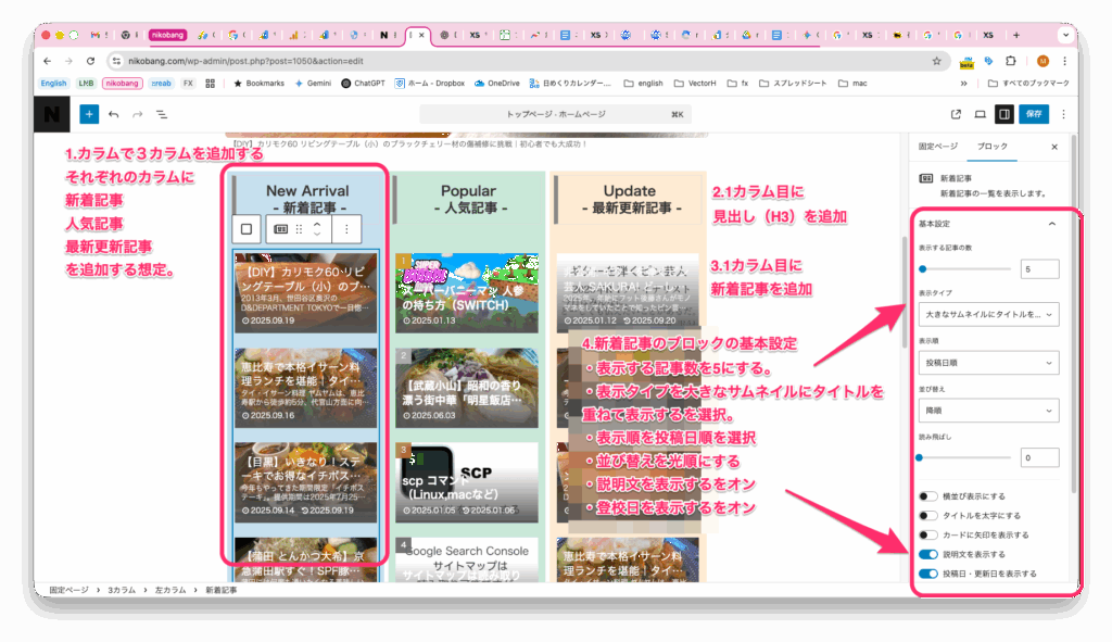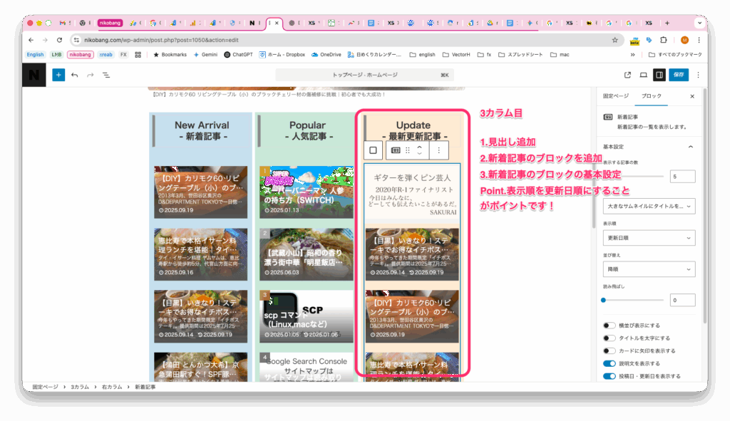 新着記事ブロックを利用します。やり方は1カラム目とほぼ同じです。ポイントは表示順を更新日順にすることです。