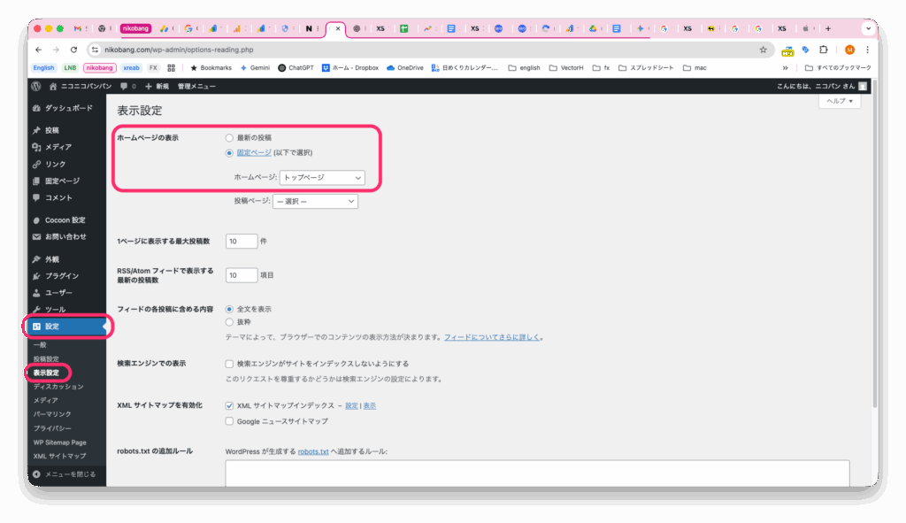以下の固定ページ「トップページ」の編集で、ページ設定のチェックボックスをオンにします。
