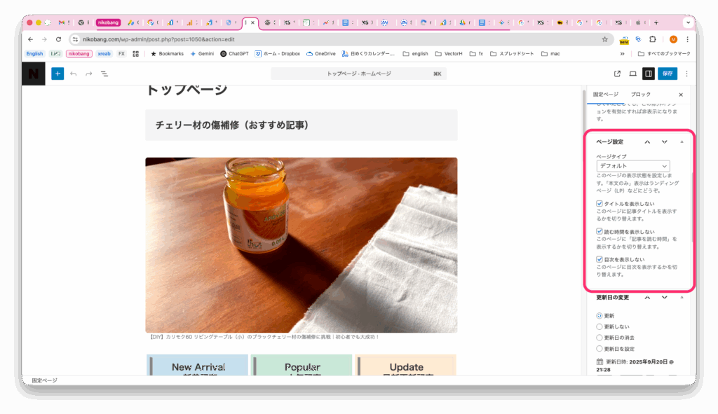 2025年9月20日:フロントページ(トップページ)の変更を追加しました。固定ページで「トップページ」を作って、フロントページに設定することで、最新記事一覧だったトップページを、任意のおすすめページや各種記事一覧を表示するように、カスタマイズしました。